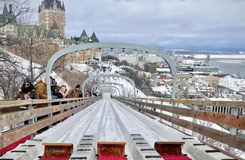 Il y a des activités d’hiver « cool ». Et il y a celles qui est dans ta bucket list des choses à faire une fois dans ta vie. La glissade Au 1884, sur la terrasse Dufferin, doit absolument en faire partie. Imagine descendre une structure en bois centenaire, une descente qui file vite (très vite), et un décor iconique, que tu te crois dans un film, juste à côté du Château Frontenac, l’hôtel le plus photographié au monde au cœur du Vieux-Québec.